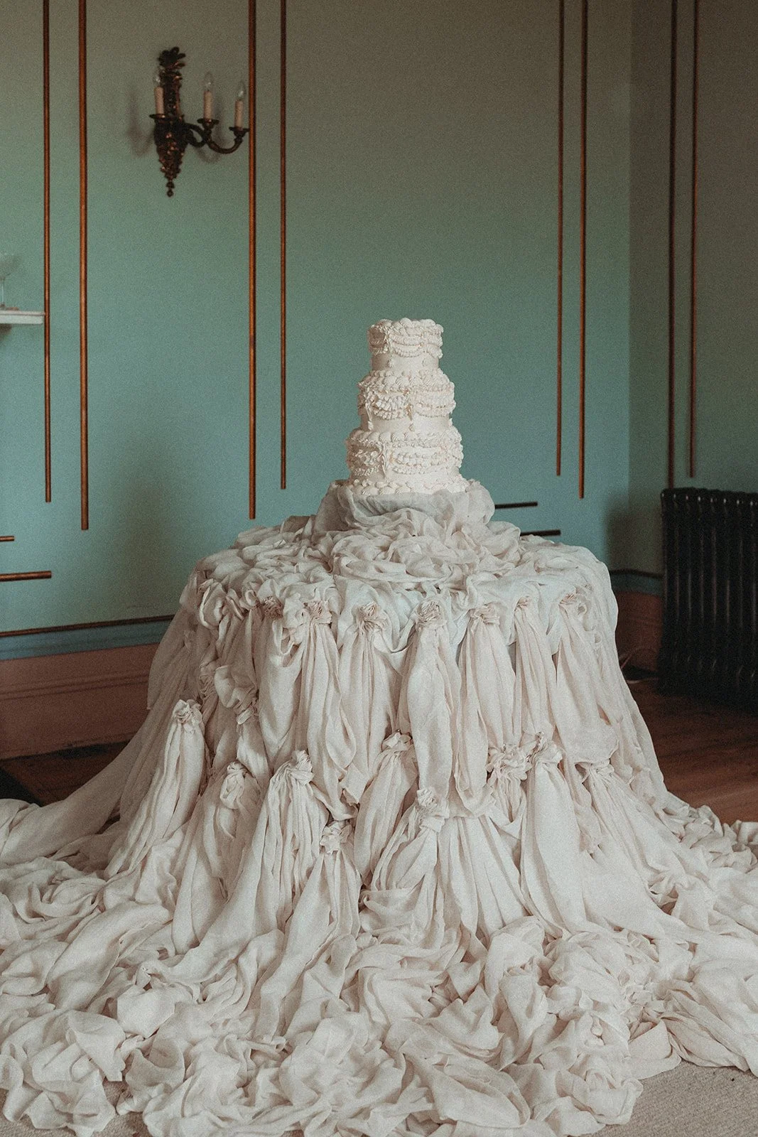 Luxurious drapery and curated fabric installations fell from the ceilings of a 19th century English manor to create an ethereal reception.